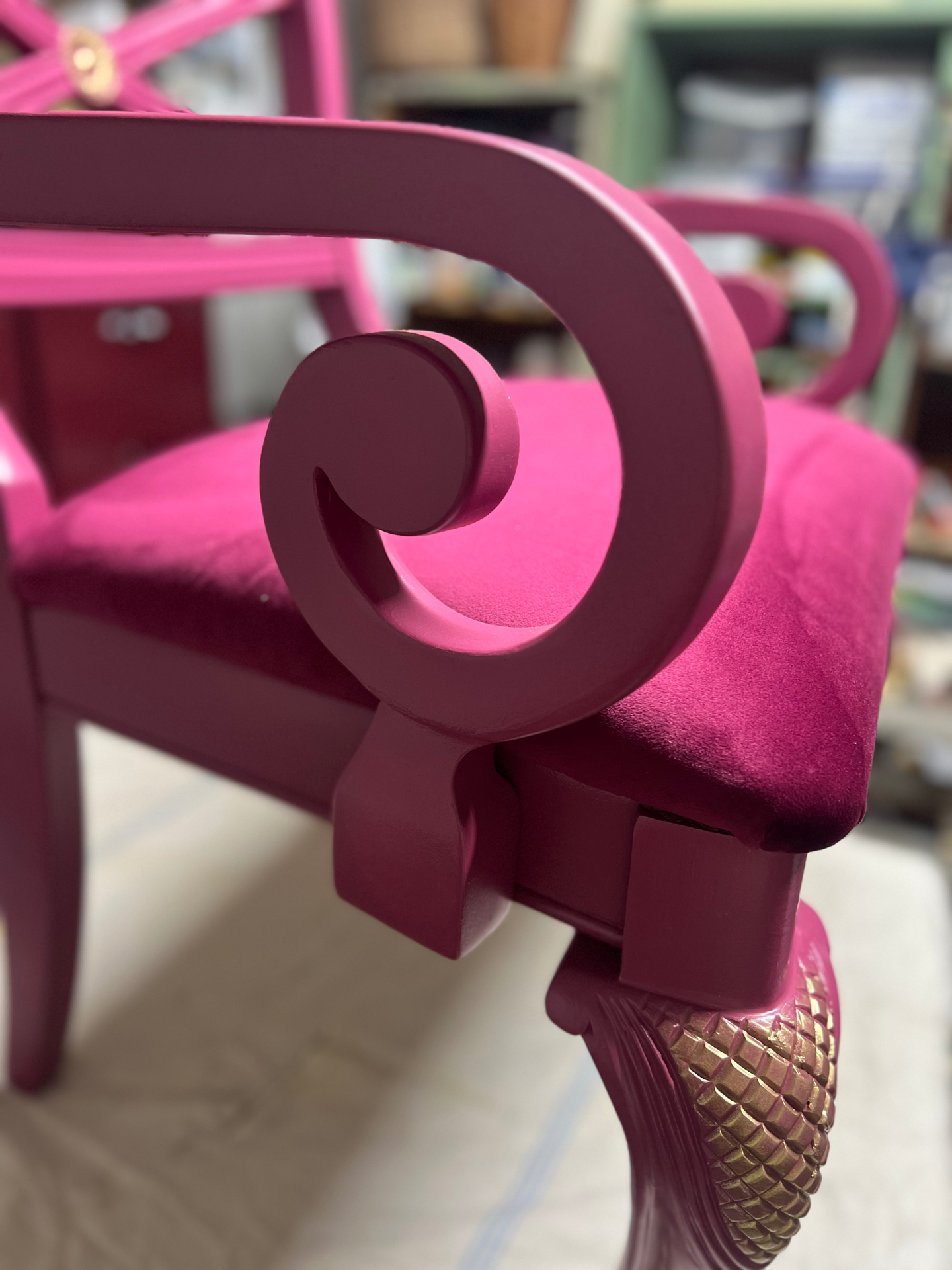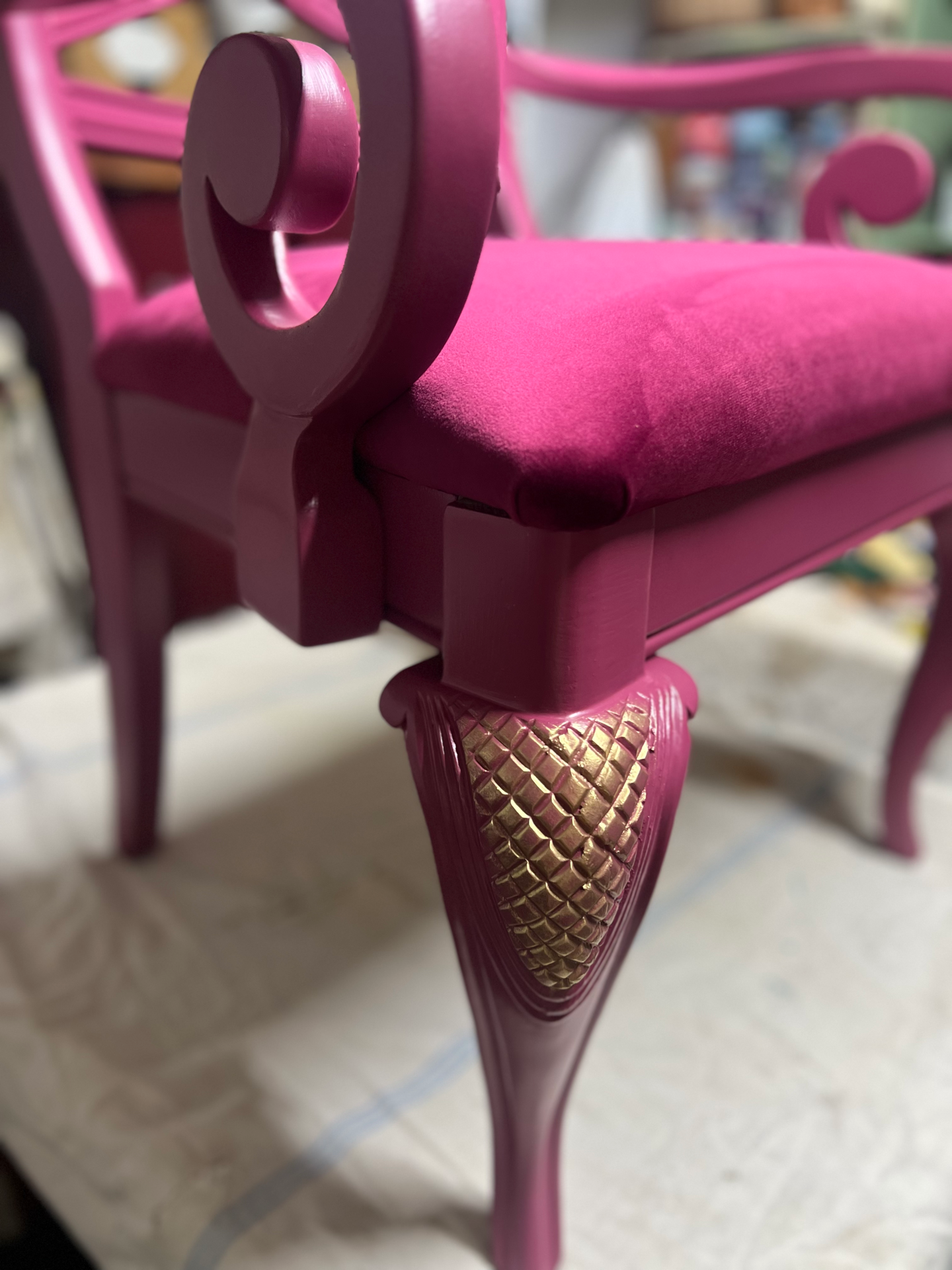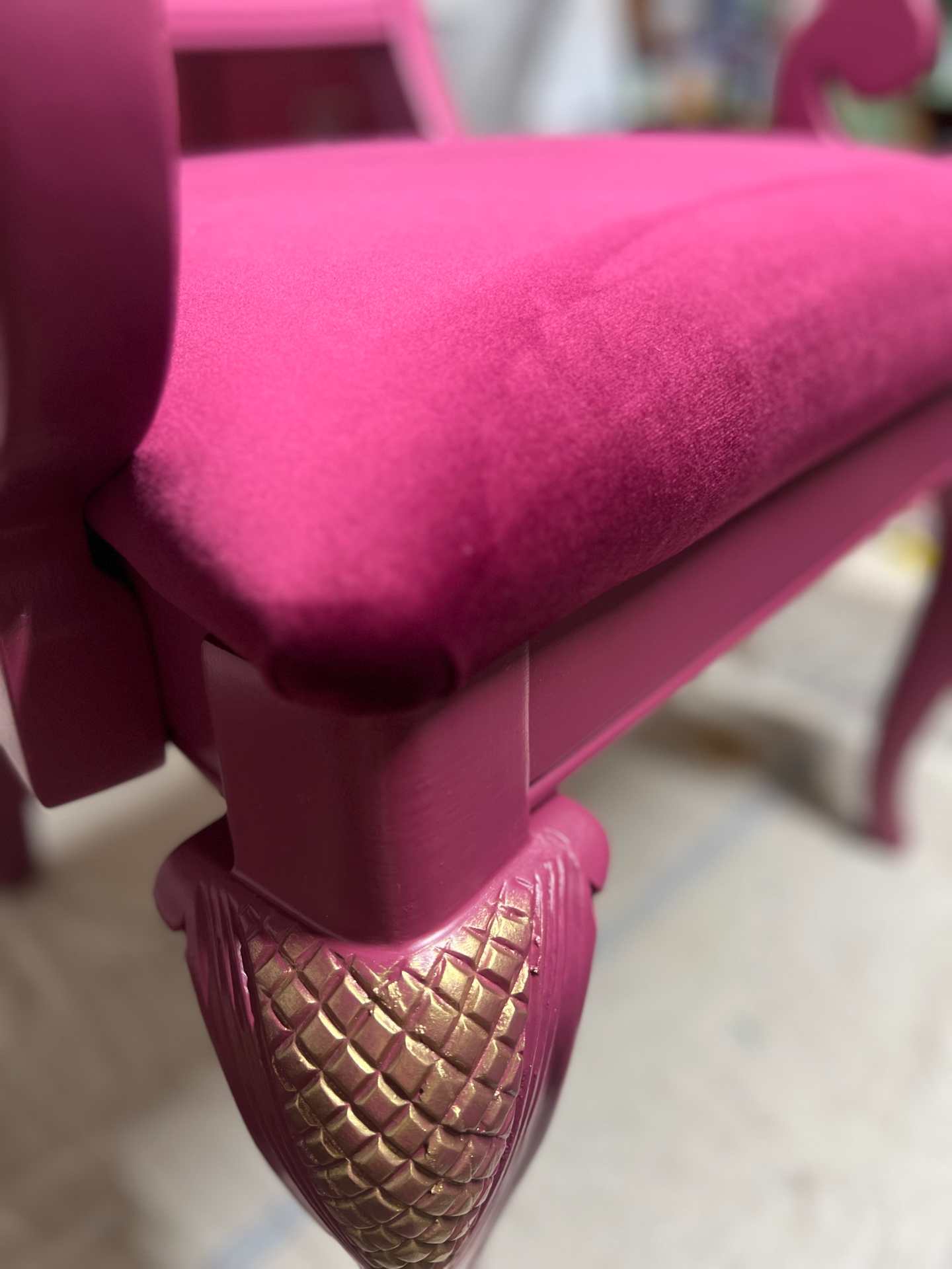 Dřevěné křesílko po redesignu. Čalounění samet. Zlaté zdobení. Krásný originální kousek do interiéru .